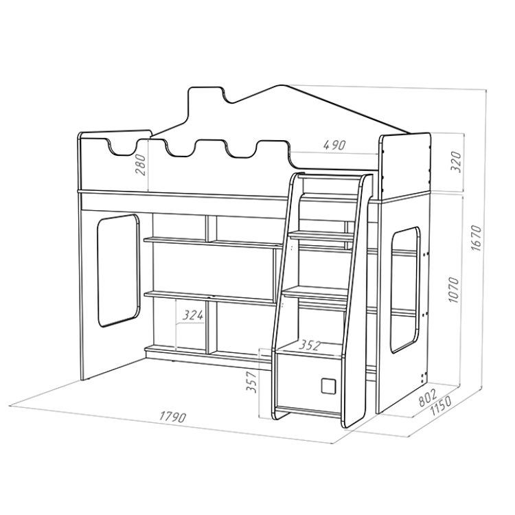 Лестница с дверцей облегчает доступ на спальное место и обеспечивает безопасность, а вместительный стеллаж позволяет хранить игрушки и другие вещи. Игровая зона под кроватью делает данную модель особенно привлекательной для маленьких пользователей. Борта, обработанные мягким  противоударным кантом,  и отсутствие острых углов делают использование кровати еще более безопасным.